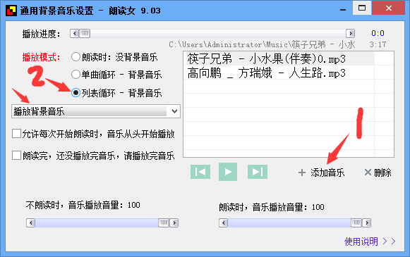 可以在朗读女软件界面中单击设置背景音乐键,进入背景音乐设置(如下图所示):